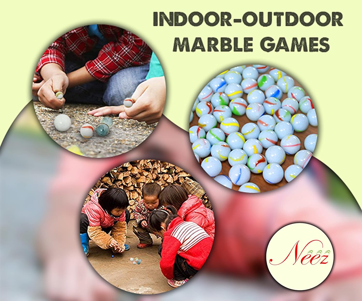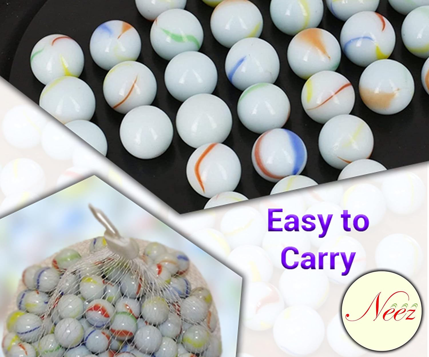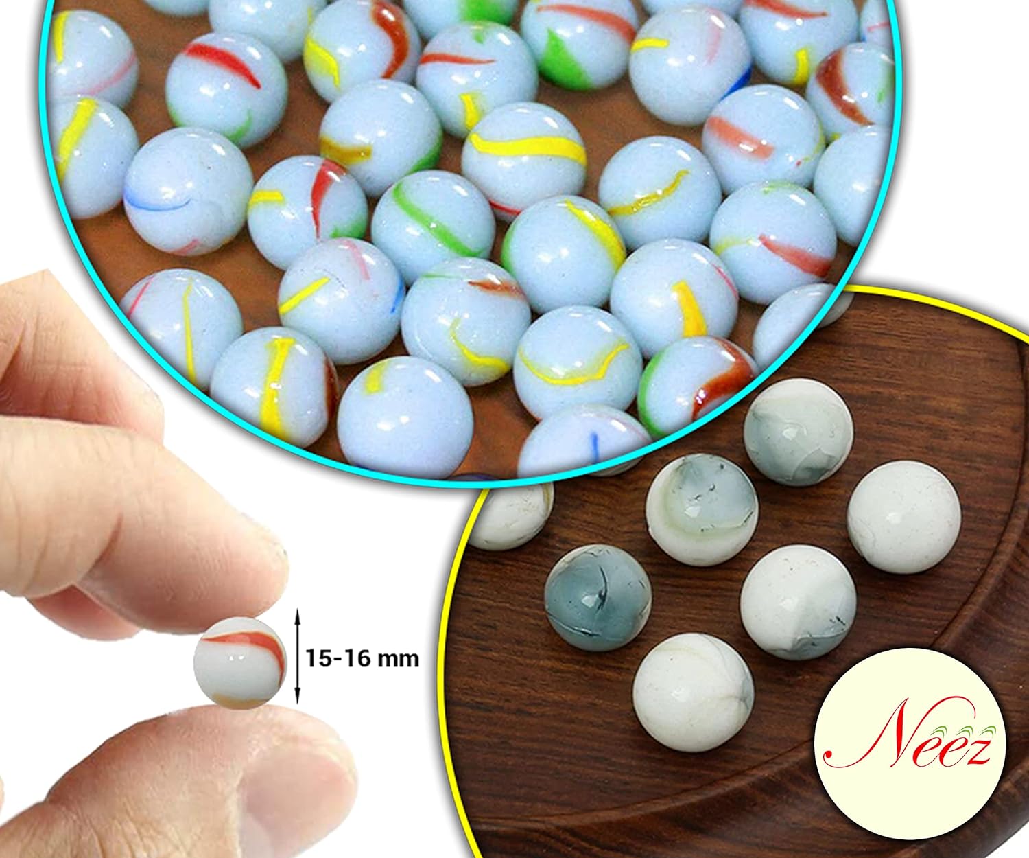 Size and Colour – Each marble has a specific craft design of red, blue, yellow and green colour with Dimension 15-16 mm with total weight for a bag is 200gm (Approximately)